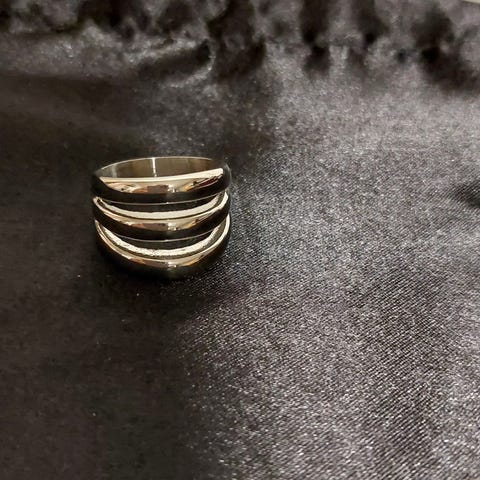 Allergiavapaata materiaalia oleva sormus. Hopean värinen jossa kirkkaita kiviä. Sisähalkaisija 19mm