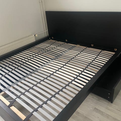 🍽️ Hyväkuntoinen IKEA MALM Sängynrunko, jossa 2 laatik & WELLPUR GOLD F110 Vaahtomuovipatja ovat myytävänä.