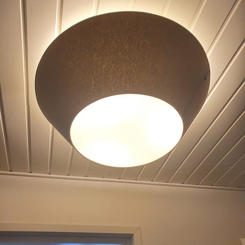 Leveys 70 cm, korkeus 25,5 cm, kevyen oloinen mutta näyttävä. Materiaalit musta tekstiilipintainen ulkoreuna ja valkoinen mattapintainen akryylilevy, jonka läpi valo siivilöityy. Valaisimeen menee kolme E27 kantaisia polttimoita. Nostettu uutena kattoon ei siirretty sen jälkeen, kunto kuin uusi. Ovh 504 e