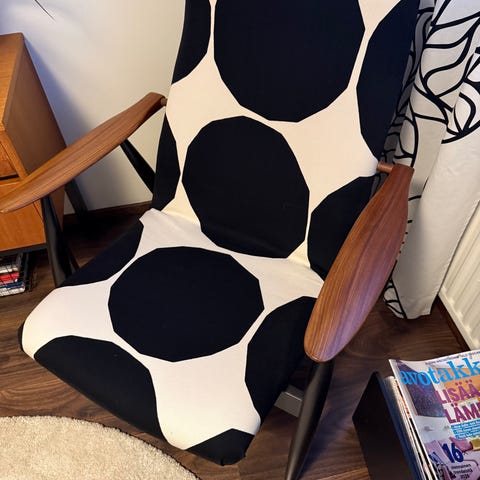 Kaikki pehmusteet uusittu ja verhoiltu Marimekon Pirputparput -markiisikankaalla. Runko putsattu ja lakattu.
