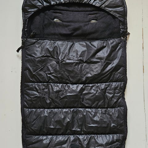 Paksu ja lämmin Brio lämpöpussi rattaisiin. Tässä on reiät viisipistevaljaille. Lämpöpussi pysyy hyvin rattaissa selkänojan yli vedettävän läpän ansiosta, takana myös jarrunyppylät tätä varten.
