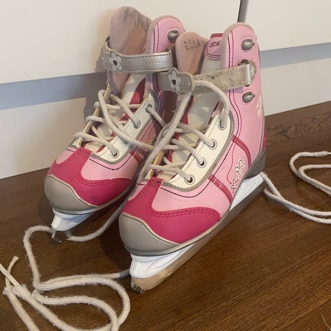 Lasten luistimet, koko 33. Väri vaaleanpunainen, koristeltu kukkakuvioilla. Pohjallisen koko noin 21cm.