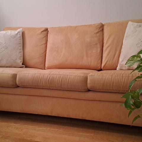 Edelleen täysin kelpo, laadukas sohva. Ostettu Iskusta 15+v sitten. Tummansininen samettimainen pehmeä materiaali, puunväriset jalat. Keskijämäkkä, ei upottava. Palvelee myös nukkumiseen - huom ei vuodesohva.