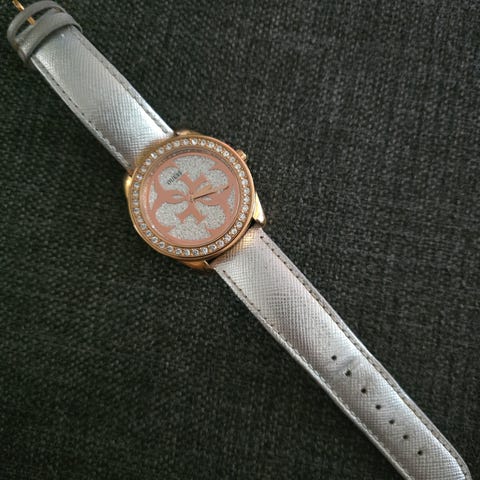 Guess naisten rannekello, jossa hopeanvärinen ranneke. Kellon kehys on koristeltu kivillä. Toimii, mutta vaatii paristonvaihdon.