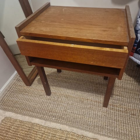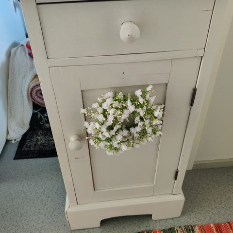 Valkoinen vanha radiopöytä, jossa on yksi vetolaatikko ja avohylly. Entisöity