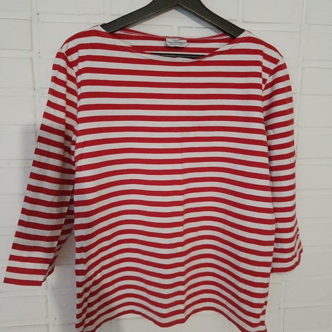 Marimekon tasaraitapaita punainen /roosan väriset raidat, löysin helmasta pari pientä pistetahraa, muuten paita ehjä ja siisti kuntoinen.
