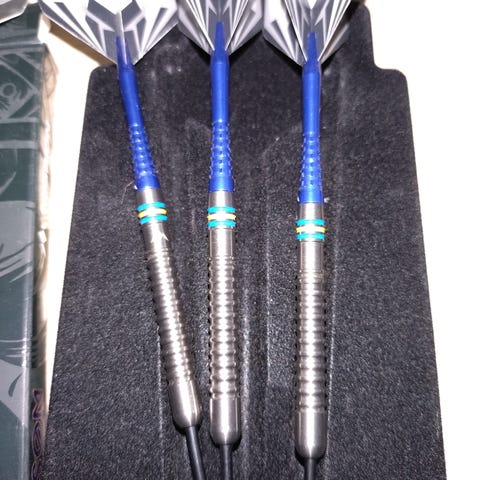 Gervin Price darts tikat. 90% tungsten. 23g. Käytetyt mutta kohtuullisen hyväkuntoiset. Sulat ja varret uusittu ja tulee mukana.