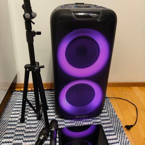 Karaokelaite joka on kosketusnäytöllinen tietokone jossa asennettuna karaokesoitin tuhannella kappaleella. Noin kolmasosa suomalaisia kappaleita. Mukana myös taustamusiikkia. Kellonaika muutettu uusi kuva.