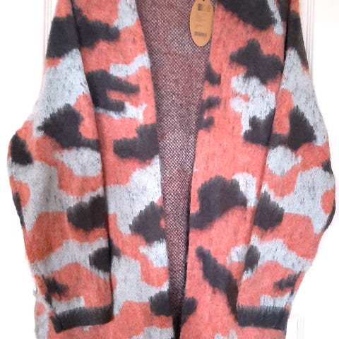 Käyttämättömäksi jäänyt käsin neulottu näyttävä pehmeä beigen ja ruskean värinen neulejakku, jossa edessä koristekirjailu ja kuusi hopeanväristä nappia. Kokomerkintä puuttuu, mutta oikea koko lienee XL.