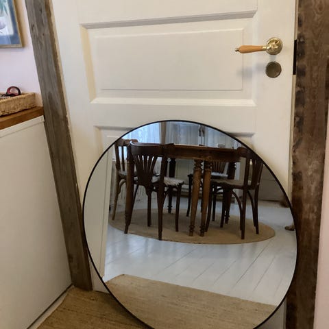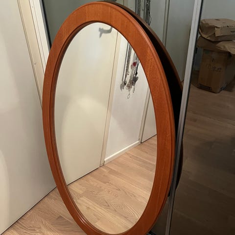 Pyöreä seinäpeili, jossa on punottu kehys. Ympärysmitta 80 cm, peilin osuus 37,5 cm.