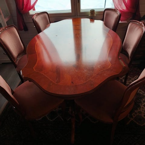 8tuolia. Yleisilme siisti vaikka käytön jälkeä on. Pöytälevyssä on naarmuja ja muutama kuumasta jäänyt vaalea läikkä. Katso kuvat.