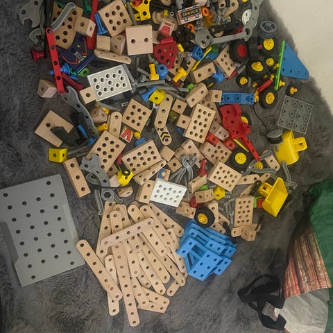 Rakennussarja, pitkät osat puuta, ruuvit muovia. Muutama ohje löytyi mukaan.