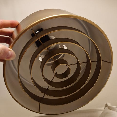Yki Nummen suunnittelemat Ornon Airam- valaisimet, joissa lukee ” Aamulla aurinko, illalla Airam ”. Toimivat.