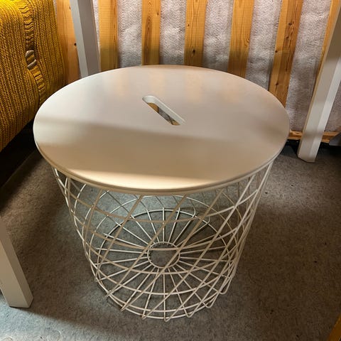 Ikean sohvapöytä kvistbro mallia. Ei enää myynnissä. Toimii lisäksi säilytyakorina. Metallirungossa ei moitteita. Puisessa kannessa useampi pienempi virhe, näkyy kuvissa.