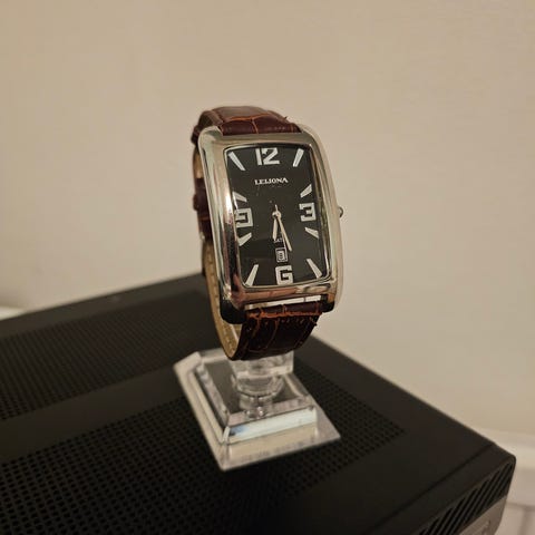 Leijona Quartz, Caratia rannekello, valmistettu ruostumattomasta teräksestä. Kello on varustettu päivämääränäytöllä ja ehjällä metallirannekkeella. Waterresistant, Swiss Made.