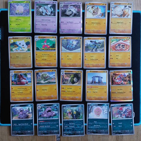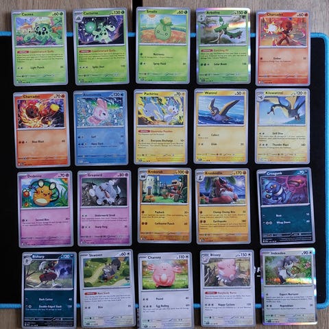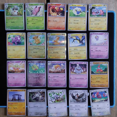 Myydään Scarlet & Violet base set Pokemon kortteja 20kpl. Hinta yhteensä 9,60e tai yksittäin ostettuna hinnat alla.