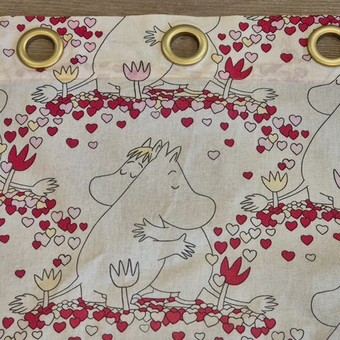 Hyväkuntoinen Muumi verho, ehkä 1990- luvun kuosi. Leveys 147 cm, korkeus 180 cm, alareunassa 4 cm päärme ja ylhäällä noin 1 cm.