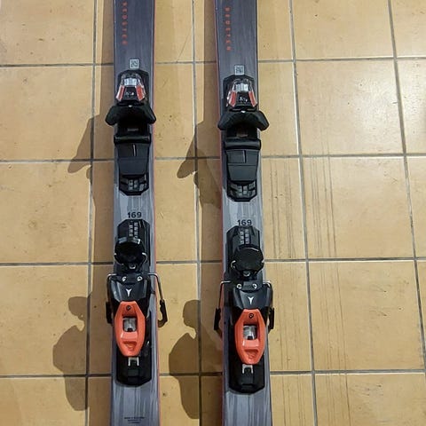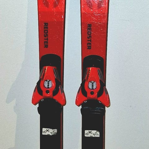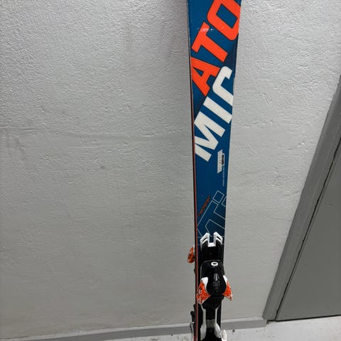 Atomic Redster S9 RS kilpasukset ja siteet. Toisessa siteessä huomauttamista, vaatii huoltoa. Toimii, mutta ei kunnolla. Muovinen (harmaa) osa murtunut, kts. Erillinen kuva. Pituus 162cm
