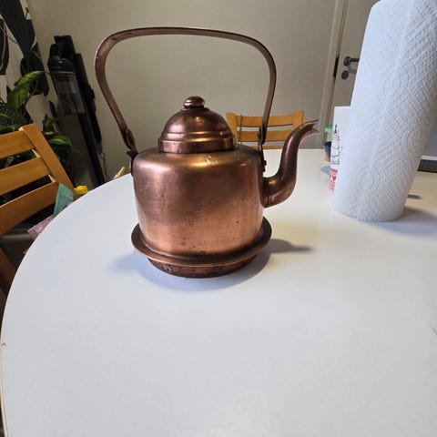 Kuparinen kahvipannu, tilavuus 2,5 litraa. Materiaalina kupari, soveltuu veden keittämiseen.