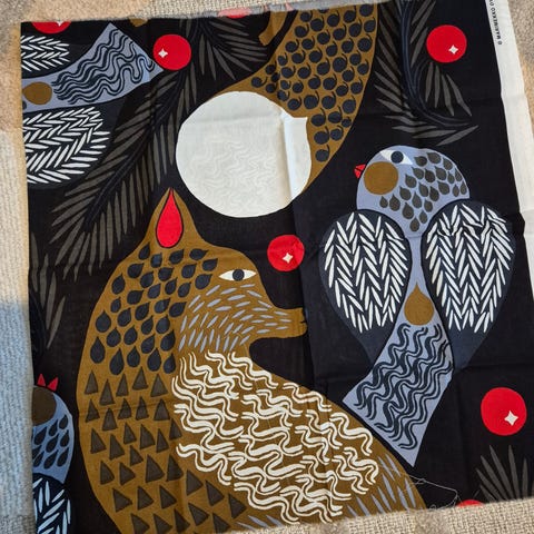 Myydään käyttämätön pala Lumimarja-kangasta. Palan koko 114*141 cm. Tästä saa vaikka keittiön kappaverhot, pari kangaskassia tai tyynyliinan.