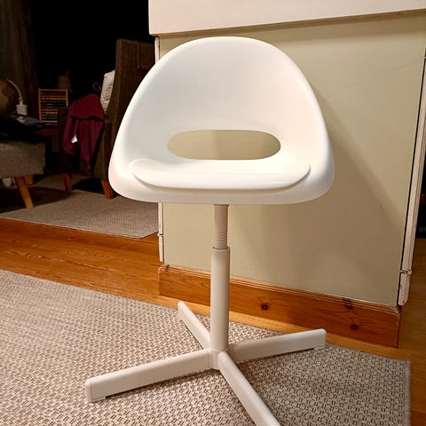 Lasten pyöreä, pyörivä tuoli, muovimateriaalia. Valkoinen kangasvarjostin, värjäymää kankaassa. Pintanaarmuja sinisessä muoviosassa, lyijykynää? Tarkempi puhdistaminen jää ostajalle. Sisätiloissa käytetty.