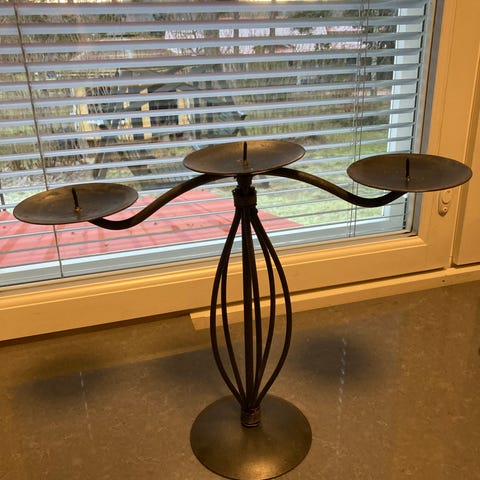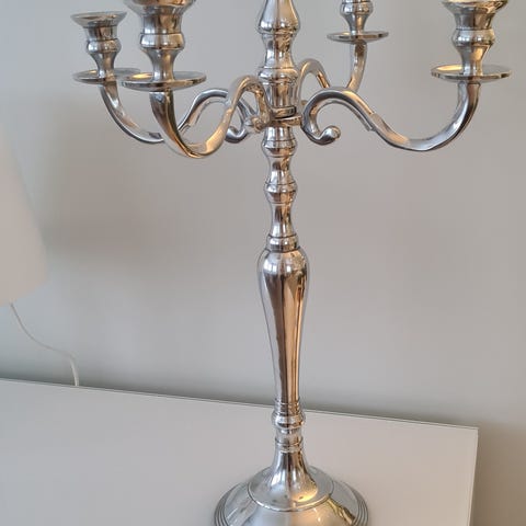 Kullan värinen, siistissä kunnossa oleva ja ehjä kynttilänjalka. Menee 7 kynttilää. Korkeus noin 41cm, leveys noin 32 cm ja syvyys noin 20cm.