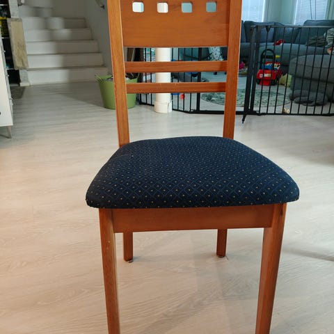 Kolme mustaa ruokapöydän tuolia. Pieniä käytönjälkiä näkyy, mutta suhteellisen siistissä kunnossa. Yhden tuolin jalasta lähtenyt ”kenkä”, jonka vuoksi tuoli on hieman heiluva.