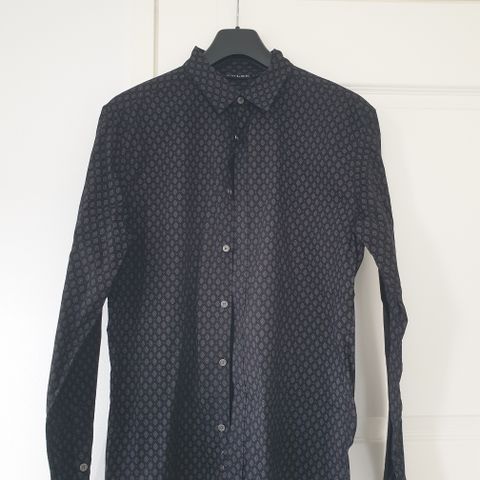 Helppohoitoinen, rypistymätön materiaali. Mukana puuvillaa, miellyttävän pehmeä päällä. Tummanharmaa, jossa hillitty raidoitus. Muutamia kertoja käytetty. Tämä on pusero arkeen ja juhlaan! Rintatasku ja normi napitus hihansuissa.