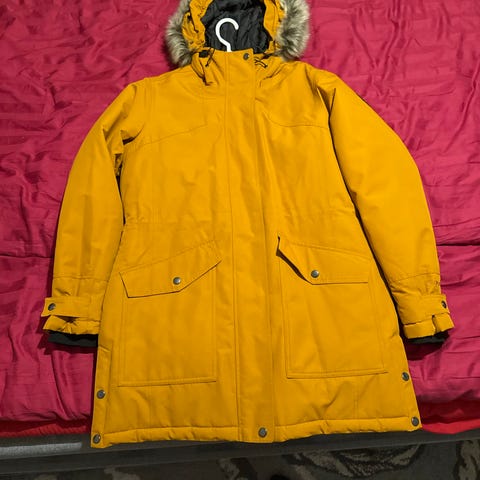 Pitämättömäksi jäänyt Catmandoon talvitakki, koko 38 (sopii myös kokoa 40 käyttävälle). Väri pirteä oranssinpunainen. Kiinteä huppu, säädettävä. Vetoketjutaskut.