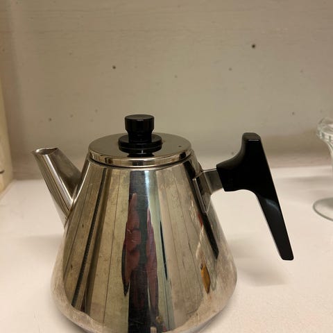 Tyylikäs, aikaa kestävää muotoilua oleva kahvipannu. 1960-70-luku design Veikko Aliklaave. Valmistaja Hackman-Sorsakoski. Huomasin vasta kuvatessa, että pohjassa on teksti sekunda.