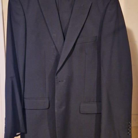 Myydään siistikuntoinen Dressmannin musta liituraitapuku, sisältäen puvun takin & housut. Takki mallia short, koko 52, olkatoppaukset. Takissa etuosassa 1 avonainen tasku, sisällä povitaskut, etuosan kiinnitys 2:lla napilla. Mitta olkapäältä helmaan noin 75 cm. Hihan mitta noin 64cm.