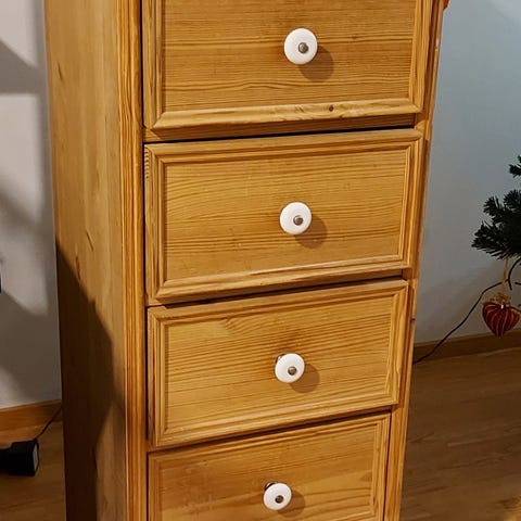 Näyttävä keltainen täyspuinen lipasto peilillä. Takorautaiset jalat, vetimet ja peilin koriste. Leveytensä puolesta mahtuu kapeaankin tilaan. Laatikoita 5 kpl. Jalkojen korkeus 36,5 cm. Peilin korkeus 60 cm, leveys 30 cm.