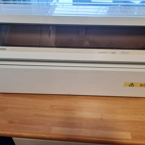 Hyväkuntoinen Rosenlew mankeli jalustalla. Liina pitää vaihtaa.