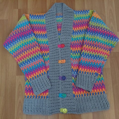 Uusi, käsin neulottu, tunikapituinen neuletakki.