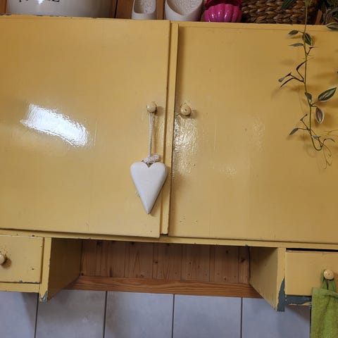 Todella kaunis vaalea puinen entisöity vanha pesukomuutti, jossa on ylähylly ja kaksi laatikkoa. Lipastossa on kaksi ovellista säilytystilaa, joissa hylly. Huonekalu soveltuu monenlaiseen säilytykseen ja sisustukseen.