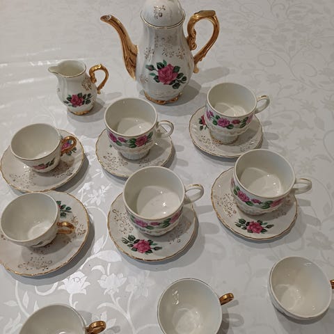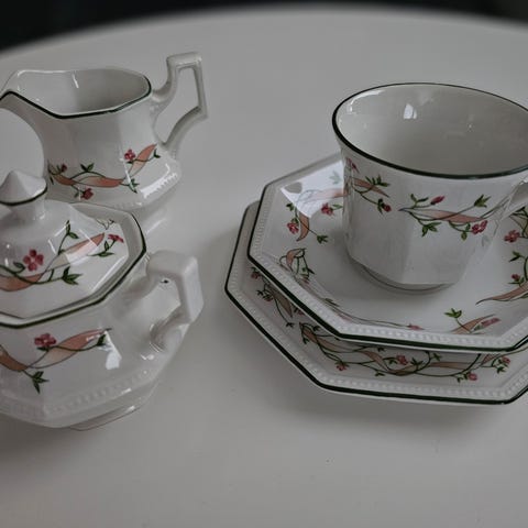 Sisältää kuusi lautasta, kuusi aluslautasta ja viisi kahvikuppia. Kupin tilavuus 2 dl, hieman normaalikuppia isompi. Vähän käytetty. Kolhuton. Voidaan avustaa kuljetuksissa.
