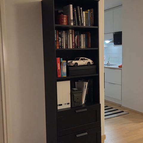 Myydään Ikeasta ostettu musta kirjahylly. Kunto oikein hyvä, aivan pieniä jälkiä muutaman vuoden käytöltä jäänyt. Hyllytasot säädettävissä helposti.
