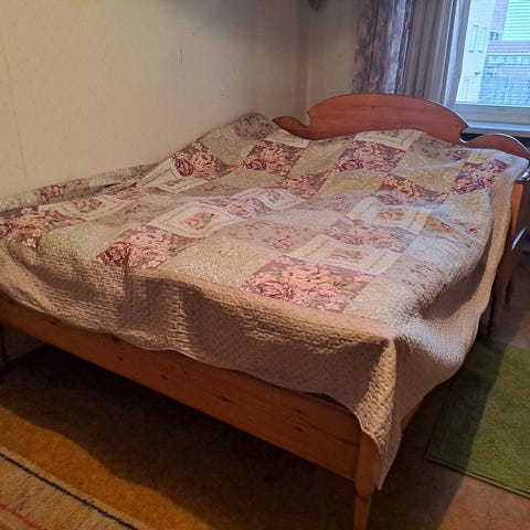 Jatkettava puusänky. Pisimmillään 200cm, lyhyimmillään 117cm (ulkomitat). Pohjarimoja ei ole maalattu uudestaan. Sängyn väri siis tuollainen kaunis petrooliin taittava tumman sininen. Yksi isompi kolhu, josta maali lohjennut (kuva). Kuljetusta varten sängyn saa kahteen noin 115 cm pitkään osaan.