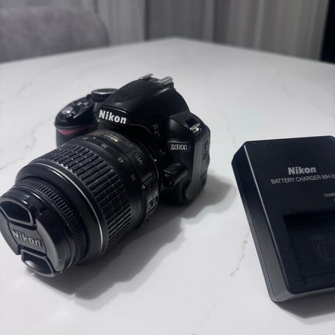 Nikon D3100 järjestelmäkamera, musta. Kamera on varustettu vaihdettavalla objektiivilla ja sen runko on valmistettu kestävästä materiaalista.