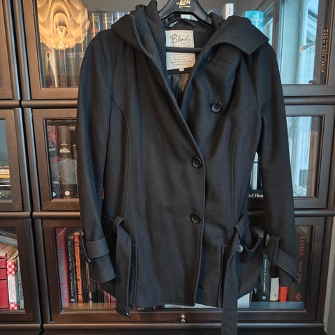 Musta Colline-merkkinen a-mallinen villakangastakki, koko 40. Itse käytin tätä raskaustakkina ja meni hyvin ihan raskauden loppuun saakka. Kaulukset tekonahkaa, täysin ehjät eivätkä ole rispaantuneet. Paljon käytetty, mutta hyvä ja siisti takki vielä seuraavalle.