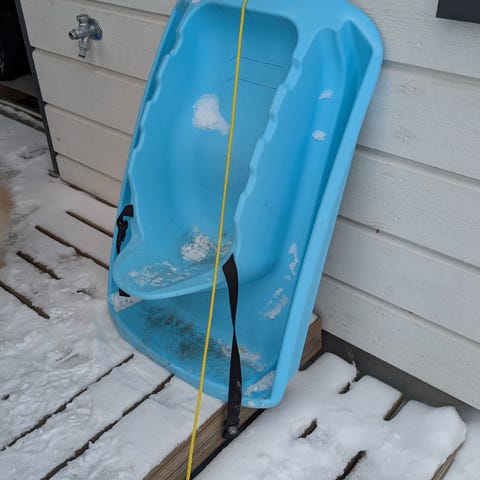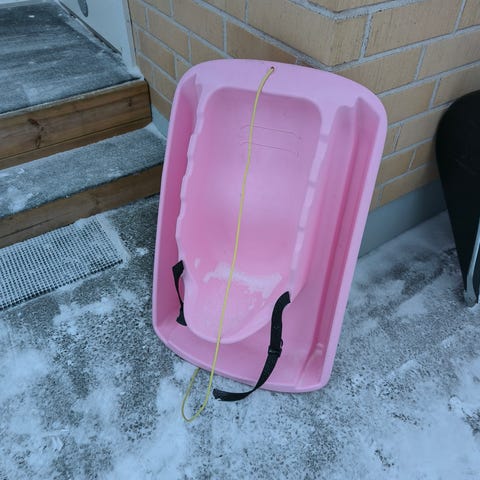 Plastex vauvapulkka. Hyvä kunto. Solki hieman haljennut, mutta pysyy kiinni (ks. kuvat). Pulkkaan liimattu tarra (ks. kuva).