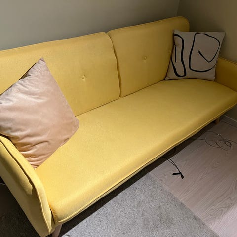 Keltainen vuodesohva. Kevyt vain 36kg helppo laittaa vuoteeksi