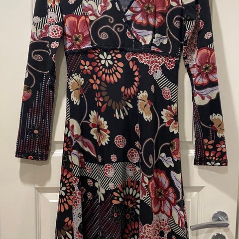 Söpö röyhelötrikoomekko. Väri vaaleanruskea. Kokolapussa L, mutta vastaa M, jolloin kivan rento vielä. Kunto erinomainen. Pidetty vain vähän.