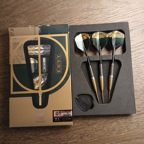 Kohtalaisesti heitellyt tikat. Mukaan paketti ja alkuperäset sulat. Myydään kuvasta poiketen mustilla 26mm Swiss Point terillä.