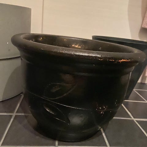 Myydään kukkaruukun suojaruukku, narupunosta ympärillä, sisusosa hieman ruostunut, korkeus 19cm, halkaisija sisäosan leveimmältä kohdalta 20cm