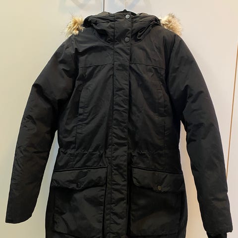 Myydään Everestin musta parkatakki, jossa irrotettava tekoturkisreunus hupussa. Koko 36,