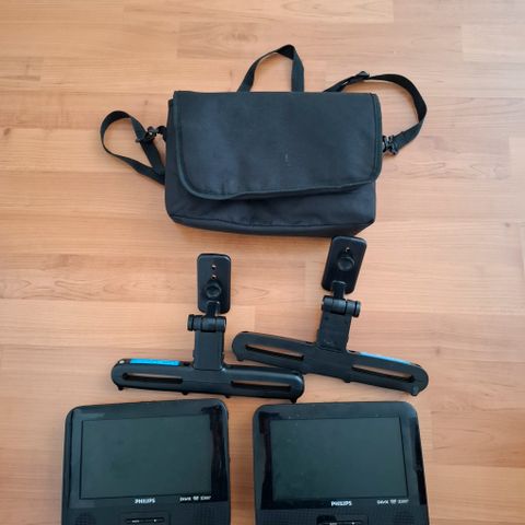 Philipsin dvd-soittimet autoon. Toimivat joko yhdessä tai erikseen. Toimii verkkovirralla tai 12 voltin liitännällä. Mukaan tulee säilytyslaukku, laturi ja kiinnikkeet etuistuimiin kiinnittämiseen.