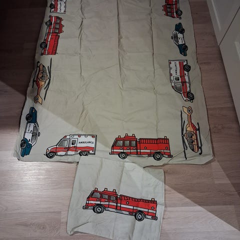 Kaikki käytetty, mutta hyvässä kunnossa. Sinisessä tyynyliinassa pieni tahra & vähän kulumaa,peiton lakanassa toinen kädensuu vähän revennyt.