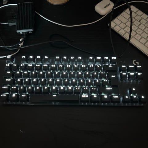 Logitech G513 näppäimistö ja rannetuki. Jäivät ylimääräiseksi langattomaan näppäimistöön vaihdettaessa.