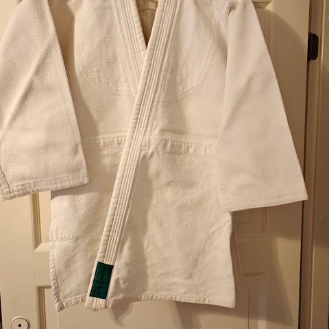 180cm kamppailulajipuku Noriksen takki ja Kizokun housut + valkoinen vyö, vahvempi malli. Ehyt kaikin puolin, kestää retuuttaa ja repiä, kiristys nyörillä vyötärön osalta, ei joustava. Voin lähettää kulut ostajalle